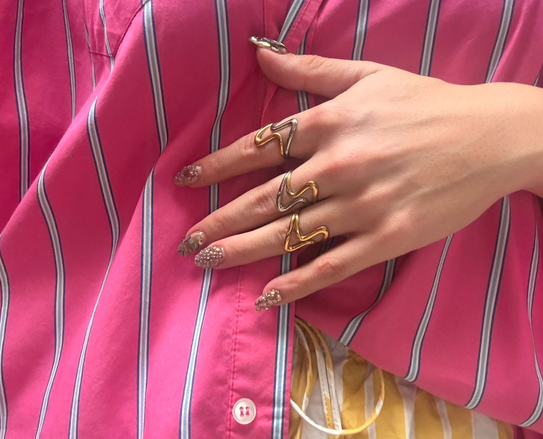 Anillo de acero inoxidable con diseño abierto con acabo dorado, plateado, o combinado. Su forma ondulada y envolvente crea un efecto visual moderno y llamativo. Destacado por su diseño minimalista pero lleno de personalidad.