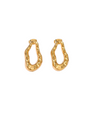 Aretes con forma ovalada irregular y un diseño hueco al centro, que simulan formas naturales y texturas fluidas. Disponibles en dorado y plateado.