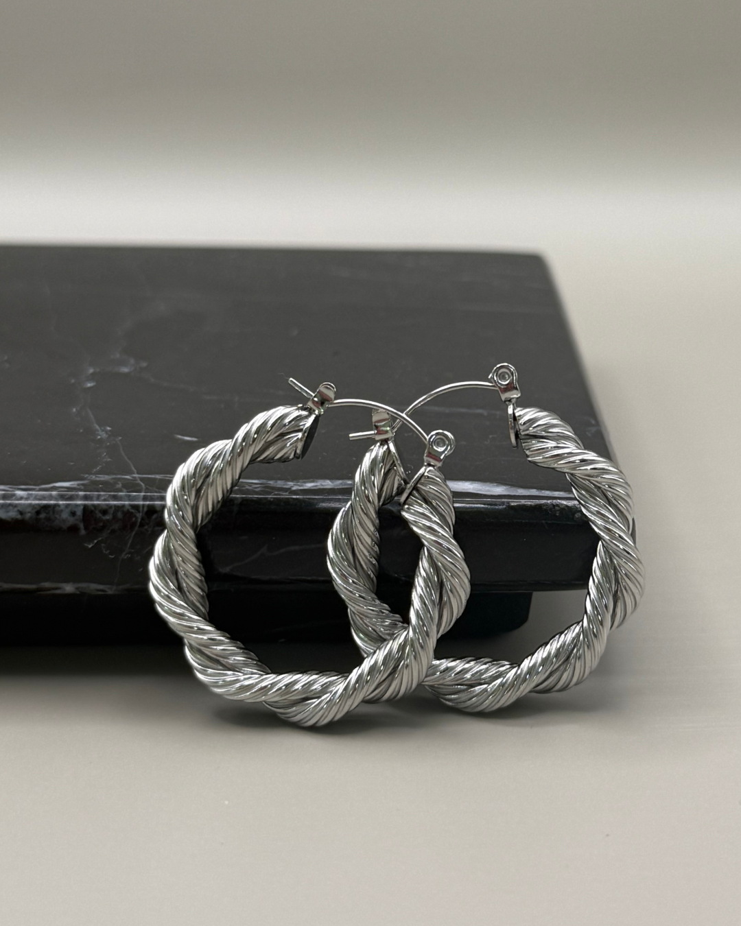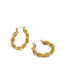 Aretes trenzados de acero inoxidable que realzan un look boho-elegante y son resistentes al agua y al sudor. Disponibles en dorado y plateado.